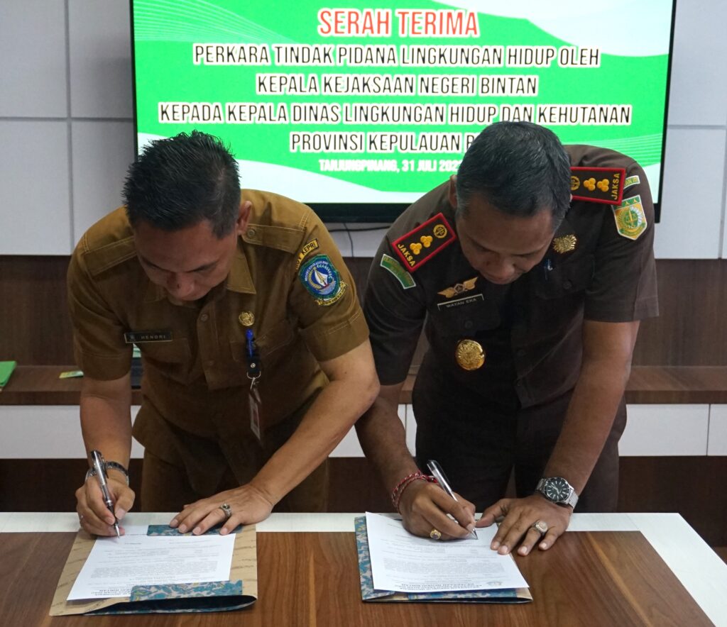 Senin, 31 Juli 2023 bertempat di ruang rapat Kejaksaan Tinggi Kepulauan Riau telah dilakukan Kegiatan Serah Terima Perkara terkait dugaan Tindak Pidana Lingkungan Hidup Oleh Kepala Kejaksaan Negeri Bintan Kepada Kepala Dinas Lingkungan Hidup dan Kehutanan Provinsi Kepulauan Riau.